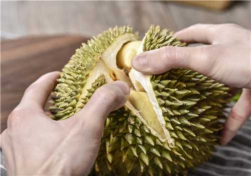 五、看开裂度 很多朋友认为,自然开口的榴莲就是好榴莲,其实并非完全如此。一般说来,通过上述四种方法检验过的榴莲,成熟度、口感应该都会不错,不一定非得是开口的。如果您要挑选外壳已经裂开的榴莲,最好选择那些裂口不要太大的,因为果实早已裂口的话,暴露在外的果肉就容易受到污染,也容易变质。如果挑选到比较成熟又刚刚裂口的榴莲,最好尽快享用,不要放置过长时间,否则也容易变质。