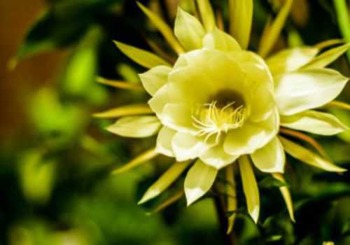 霸王花的植株是三棱状茎,而昙花是扁平的片状茎。霸王花的花比昙花的花稍大些,花萼是青白色,而昙花的则是暗红色的。特别不同的是昙花一般晚上开花,剑花则是在白天开放。