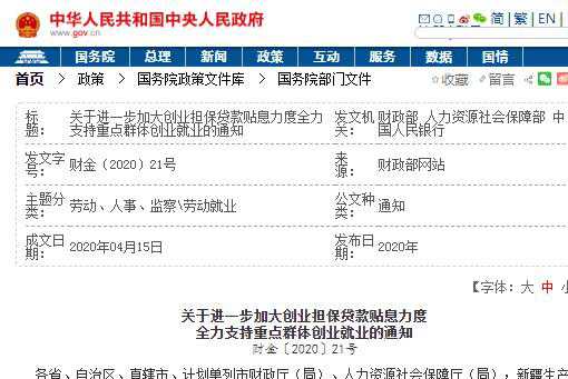 关于进一步加大创业担保贷款贴息力度全力支持重点群体创业就业的通知 财金〔2020〕21号 各、自治区、直辖市、计划单列市财政厅(局)、人力资源社会保障厅(局),新疆生产建设兵团财政局、人力资源社会保障局,中国人民银行上海总部、各分行、营业管理部、会(首府)城市中心支行、各副级城市中心支行: 当前新冠肺炎疫情对就业创业造成一定影响。为深入贯彻落实习近平总书记在统筹推进新冠肺炎疫情防控和经济社会发展工作部署会议上的重要讲话精神,全面强化稳就业举措,更好发挥创业担保贷款贴息资金引导作用,加强资金保障,全力支持复工复产和创业就业,推动经济社会有序稳定发展,现通知如下: 一、扩大覆盖范围 (一)增加支持群体。自通知印发之日至2020年12月31日新发放贷款,应将下列群体纳入支持范围:一是受疫情影响较大的批发零售、住宿餐饮、物流运输、文化旅游等行业暂时失去收入来源的个体工商户;二是贷款购车专门用于出租运营的个人;三是贷款购车加入网络约车平台的专职司机(需平台提供专职司机“双证”等证明材料);四是符合条件的出租车、网约车企业或其子公司;五是对已享受创业担保贷款贴息政策且已按时还清贷款的个人,在疫情期间出现经营困难的,可再次申请创业担保贷款。 (二)降低申请门槛。小微企业当年新招用符合条件创业担保贷款申请条件的人数与企业现有在职职工人数的占比,由20%下降为15%,超过100人的企业下降为8%。 二、适当提高额度 符合条件的个人最高可申请创业担保贷款额度由15万元提高至20万元。对符合条件的个人创业担保贷款借款人合伙创业的,可根据合伙创业人数适当提高贷款额度,最高不超过符合条件个人贷款总额度的10%。 三、允许合理展期 对流动性遇到暂时困难的小微企业和个人(含个体工商户,下同)创业担保贷款,可给予展期,最长可展期至2020年6月30日,展期期间财政给予正常贴息。对已发放的个人创业担保贷款,借款人患新冠肺炎的,展期期限原则上不超过1年。 四、降低利率水平 金融机构新发放创业担保贷款利率应适当下降,具体标准为:贫困地区(含国家扶贫开发工作重点县、全国14个集中连片特殊困难地区)贷款利率上限由不超过LPR+300BP下降为LPR+250BP,中、西部地区由不超过LPR+200BP下降为LPR+150BP,东部地区由不超过LPR+100BP下降为不超过LPR+50BP。具体贷款利率由经办银行根据借款人和借款企业的经营状况、信用情况等与借款人和借款企业协商确定。本通知印发之日前已发放和已签订合同但未发放的贷款,仍按原规定执行。 五、合理分担利息 自2021年1月1日起,新发放的个人和小微企业创业担保贷款利息,LPR-150BP以下部分,由借款人和借款企业承担,剩余部分财政给予贴息。 六、简化审批程序 推行电子化审批,逐步实行全程线上办理。各地人力资源社会保障部门(以下简称人社部门)可通过所在地社区、村委会、群团组织、金融机构、担保机构等推荐方式拓展创业担保贷款申请渠道,推广依托社会保障卡搭载创业担保贷款申请、审核和拨付功能。逐步推行“一站式”服务,实行人社部门审核借款人资格、担保机构尽职调查、金融机构贷前调查“多审合一”,避免重复提交材料。人社部门资格审核原则上应压缩在7个工作日内,担保机构尽职调查压缩在3个工作日内,金融机构贷款受理至发放原则上压缩在5个工作日内,确需办理反担保、抵押等手续的可适当延长。对不符合条件的,应在5个工作日内通知申请人并说明原因,一次性告知需补充完善的手续和资料。鼓励各地自主整合担保基金与经办金融机构办理流程,进一步提升服务效率。 七、免除反担保要求 自通知印发之日起,新发放的10万元及以下的个人创业担保贷款,以及全国创业孵化示范基地或信用社区(乡村)推荐的创业项目,获得设区的市级以上荣誉称号的创业人员、创业项目、创业企业,经金融机构评估认定的信用小微企业、商户、农户,经营稳定守信的二次创业者等特定群体,免除反担保要求。鼓励有条件的地方对其他创业担保贷款逐步降低或免除反担保要求。 八、提升担保基金效能 各地相关部门要简化担保条件和手续,制定担保基金尽职免责和激励约束办法,合理提升担保基金代偿比例和效率。实行担保基金放大倍数与贷款还款率挂钩机制,创业担保贷款上年到期还款率(上年累计到期贷款实际回收金额/上年累计到期贷款应回收金额)达到90%以上的,本年可适当提高放大倍数至担保基金存款余额的10倍。 九、鼓励地方加大支持力度 各地可适当放宽创业担保贷款借款人条件、提高贷款额度上限,由此额外产生的贴息资金支出由地方财政承担。 十、强化统筹协调与激励约束 财政、人民银行、人社部门要完善协作机制,加快健全完善创业担保贷款分类统计制度,加强部门间信息共享,充分整合资格审核、贴息、贷款发放等数据。人社部门负责做好资格审核工作。各担保基金运营管理机构和经办金融机构按季向当地人民银行分支机构、财政、人社部门报告担保基金和创业担保贷款发放使用情况。人民银行分支机构强化普惠金融定向降准考核、专项金融债发行等外部激励约束,引导经办金融机构提升服务质效;财政部门负责做好担保基金、财政贴息和奖补资金的管理工作,明确对担保基金来源和补偿机制,强化考核和监督检
