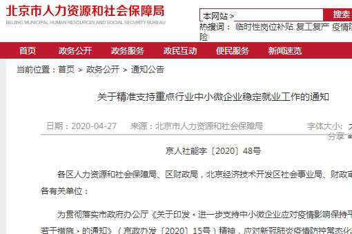 2.流程 各区政府、北京经济技术开发区管委会应按上述条件对企业进行认定,于5月6日将企业名单(附件)报市人力资源和社会保障局,同时按行业分别报市科委、市经济信息化局、市委宣传部、市文化和旅游局、市体育局、市商务局等市级行业主管部门备案。 符合条件的企业应按照《关于推进职业技能提升行动“互联网++职业技能培训”工作的通知》相关要求,登录北京市职业技能提升行动管理平台(www.bjjnts.cn)组织开展线上或线下培训,培训完成后登录北京市人力资源和社会保障局官网(http://rsj.beijing.gov.cn)“技能提升行动”-“援企稳岗培训补贴”申报补贴,由参保所在区人力资源和社会保障局、北京经济技术开发区社会事业局审核后,按职业技能提升行动专项资金拨付流程将补贴拨付至企业。 符合条件的企业在北京市职业技能提升行动管理平台填报培训计划,在线做出承诺后,可同时提交临时性岗位补贴申请。参保所在区人力资源和社会保障局、北京经济技术开发区社会事业局在2个工作日内完成审核后,提交市人力资源和社会保障局。市人力资源和社会保障局对审核情况进行汇总,将临时性岗位补贴资金按照社保基金拨付流程拨付至申请企业。 附: 关于精准支持重点行业中小微企业稳定就业工作的通知 京人社能字〔2020〕48号 各区人力资源和社会保障局、区财政局,北京经济技术开发区社会事业局、财政审计局,各有关单位: 为贯彻落实市政府办公厅《关于印发﹤进一步支持中小微企业应对疫情影响保持平稳发展若干措施﹥的通知》(京政办发〔2020〕15号)精神,应对新冠肺炎疫情防控常态化新形势,精准支持重点行业中小微企业稳定就业岗位,现将有关事项通知如下。 一、政策主要内容 (一)企业条件 1.符合首都功能定位和区域发展规划,属于科技创新、城市运行保障、生活性服务业等重点行业参加本市失业保险的中小微企业; 2.受疫情影响,2020年2-4月生产经营收入同比下降80%(含)以上。 (二)补贴标准 5月6日至,每名参加失业保险的职工,参加培训时长累计不低于20课时(900分钟)的,按照每人500元的标准给予企业以训稳岗培训补贴,在此基础上每增加20课时(900分钟),补贴金额增加500元,培训补贴最高不超过120课时(5400分钟)3000元,所需资金从职业技能提升行动专项资金列支;对开展培训的职工按照每人1540元的标准给予企业临时性岗位补贴,所需资金从本市失业保险基金列支。 (三)申请流程 各区政府、北京经济技术开发区管委会应按上述条件对企业进行认定,于5月6日将企业名单(附件)报市人力资源和社会保障局,同时按行业分别报市科委、市经济信息化局、市委宣传部、市文化和旅游局、市体育局、市商务局等市级行业主管部门备案。 符合条件的企业应按照《关于推进职业技能提升行动“互联网+职业技能培训”工作的通知》相关要求,登录北京市职业技能提升行动管理平台(www.bjjnts.cn)组织开展线上或线下培训,培训完成后登录北京市人力资源和社会保障局官网(http://rsj.beijing.gov.cn)“技能提升行动”-“援企稳岗培训补贴”申报补贴,由参保所在区人力资源和社会保障局、北京经济技术开发区社会事业局审核后,按职业技能提升行动专项资金拨付流程将补贴拨付至企业。 符合条件的企业在北京市职业技能提升行动管理平台填报培训计划,在线做出承诺后,可同时提交临时性岗位补贴申请。参保所在区人力资源和社会保障局、北京经济技术开发区社会事业局在2个工作日内完成审核后,提交市人力资源和社会保障局。市人力资源和社会保障局对审核情况进行汇总,将临时性岗位补贴资金按照社保基金拨付流程拨付至申请企业。 以训稳岗培训补贴和临时性岗位补贴申请时间截止2020年8月31日。 二、工作要求 (一)加强组织领导。各区要充分认识精准支持重点中小微企业稳定就业工作的重要性和紧迫性,明确职责分工,抓好工作落实。 (二)优化经办服务。各区要遵循“一网通核”原则,强化信息共享,提高经办服务质量和效率。落实补贴申报程序,引导符合条件的企业进行网上申报。 (三)严格监督管理。各区要履行企业认定、审核拨付和监管的主体责任,做好经费申报工作的指导服务,严防冒领、骗取现象。 (四)加大宣传力度。各区要加大对补贴政策的宣传力度,推动信息公开,充分发挥舆论导向作用,提高政策知晓度,大力宣传解读政策,使企业了解办理程序。 北京市人力资源和社会保障局北京市财政局 2020年4月24日 重点行业中小微企业明细表