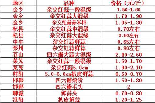 目前大蒜平均价格在2.4-2.5元一斤左右,有的地区大蒜价格下降到1.5-1.8元一斤。新大蒜价格下跌至1.5元一斤以下,到目前为止价格保持在0.8-1.5元一斤左右,所以今年大蒜种植户有可能会出现亏损的情况。 |