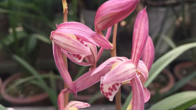 墨兰开的花花瓣近似卵形,花葶很粗壮,墨兰的花色有很多种,比较常见的就是紫褐色、暗紫色,也有白色、黄绿色、桃红色,还有复色的花朵,开花时会有花香。