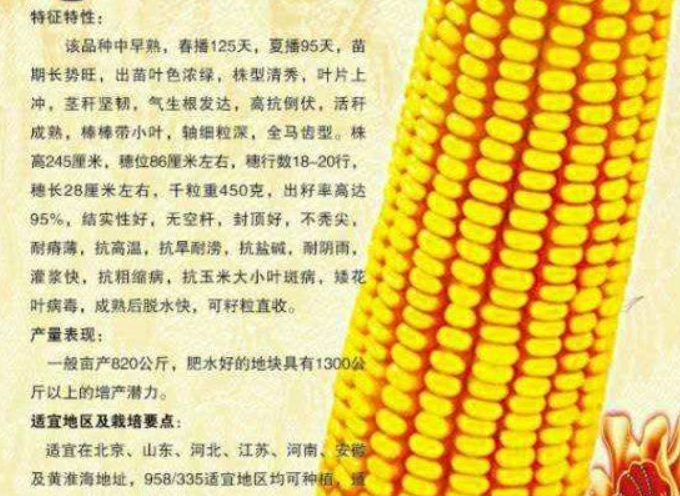 喜玉968玉米是一个高产、优质、多抗等特点的玉米品种,整个生育期长128天左右,适合在4月中下旬播种,每亩密度适宜在4000株左右,亩产量在716公斤左右。 |