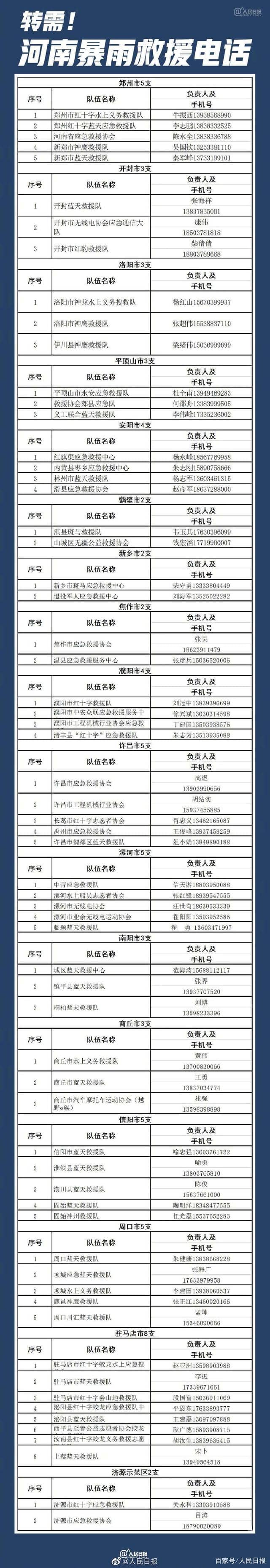 3.三是强降水范围广 全省共有4098个雨量站降水量超过50毫米,大于100毫米的有1923个,大于250毫米的有606个; 而河南此次暴雨主要从18日夜间开始,北部、中部、西部地区普降暴雨、大暴雨,局地特大暴雨。 以上就是河南暴雨紧急求助通道和救援电话的介绍,希望能帮助到受困需要救助的人群。 |