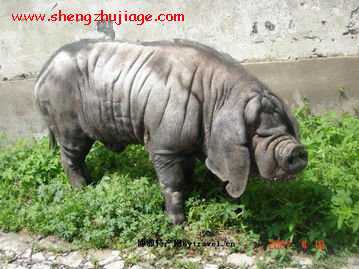 背腰宽而微凹,胸较深,腹大下垂,臀宽而倾斜,大腿欠丰满,后躯皮肤有皱褶,全身被毛稀松,毛色全黑或表灰色,或六白不全。奶头一般为8-9对。