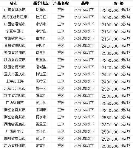 地区 价格(元/吨) 重庆市 3085.0 重庆市 玉米价格 14%水分 3085.0...