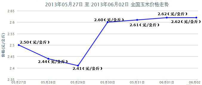 2013年22周(2013年5月27日-2013年6月2日)全国最新玉米价格行情走势图,如下: