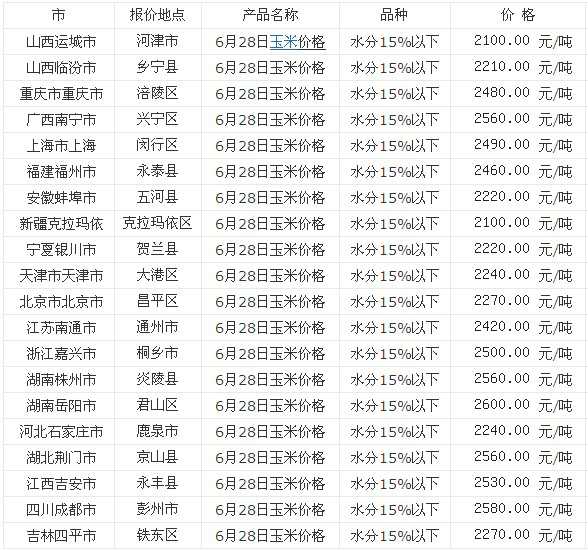 2013年6月28日全国今天最新玉米价格行情走势,如下: