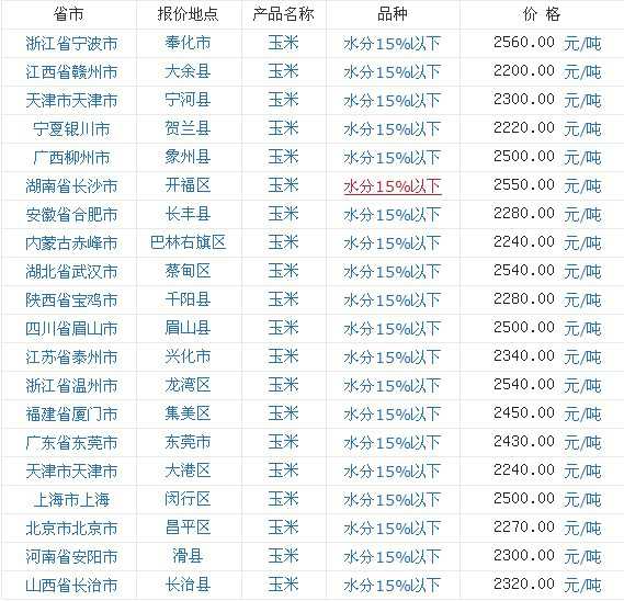 地区 价格(元/吨) 黑龙江省 2571.0 七台河市 玉米价格 14%水分 2571.0 伊春市 玉米价格 14%水分 2571.0 佳木斯市 玉米价格 14%水分 2571.0 双鸭山市 玉米价格 14%水分 2571.0 哈尔滨市 玉米价格 14%水分 2571.0 大兴安...