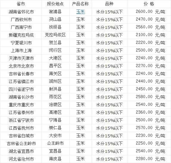 地区 价格(元/吨) 湖南省 2983.4 娄底市 玉米价格 14%水分 2999.0 岳阳市 玉米价格 14%水分 2999.0 常德市 玉米价格 14%水分 3020.0 张家界市 玉米价格 14%水分 2999.0 怀化市 玉米价格 14%水分 2999.0 株洲市 玉米价格...