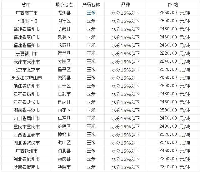 地区 价格(元/吨) 黑龙江省 2571.0 七台河市 玉米价格 14%水分 2606.0 伊春市 玉米价格 14%水分 2606.0 佳木斯市 玉米价格 14%水分 2606.0 双鸭山市 玉米价格 14%水分 2606.0 哈尔滨市 玉米价格 14%水分 2606.0 大兴安...