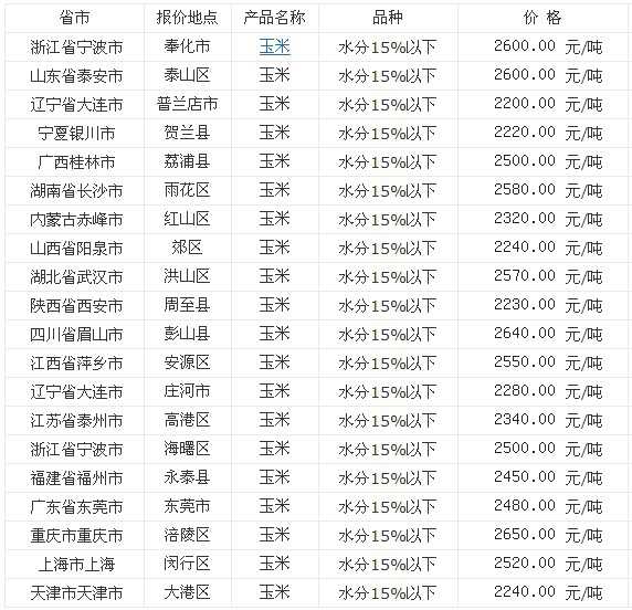 地区 价格(元/吨) 重庆市 3085.0 重庆市 玉米价格 14%水分 3085.0...