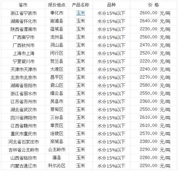地区 价格(元/吨) 上海市 2850.64 上海市 玉米价格 14%水分 2850.64...