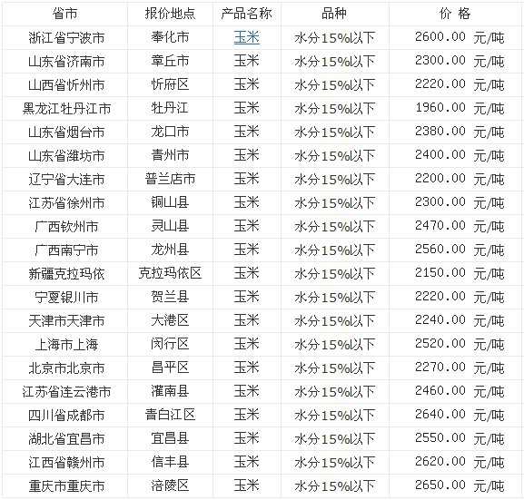 地区 价格(元/吨) 北京市 2699.68 北京市 玉米价格 14%水分 2699.68...