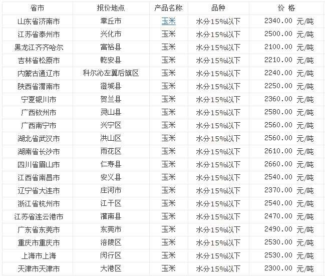 地区 价格(元/吨) 上海市 2847.21 上海市 玉米价格 14%水分 2847.21...