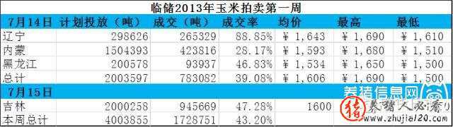 首先,从上周拍卖情况来看,黑龙江、内蒙古、辽宁13年临储玉米成交率分辞为46.83%、28.17%、88.85%,总成交率39.08%,成交价格区间为1500-1690元/吨,均匀成交价1606元/;吉林方面拍卖成交率47.28%,成交价格区间为1550-1670元/吨,成交均价1600元/吨。
