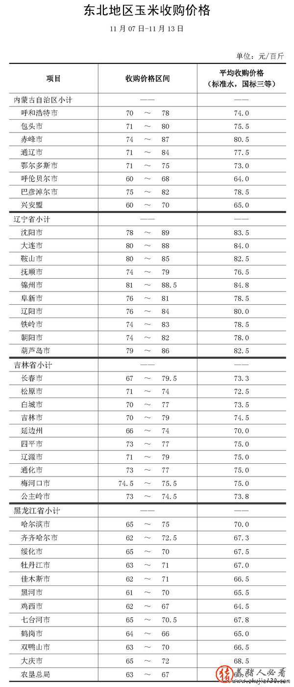 据国家粮油信息中央监测,2016年11月7日~11月13日,东北地区玉米收购价格总体平衡,局部地区价格略有波动。分地区玉米收购价格见下表: