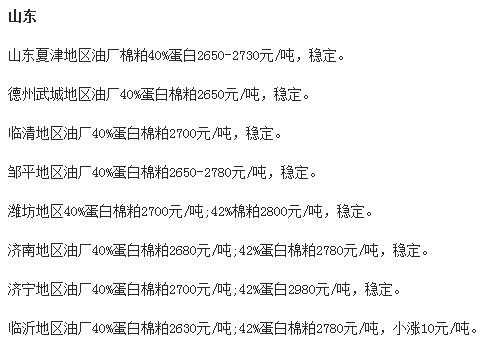 安徽:安徽地区40%蛋白棉粕¥2730元/吨;42%蛋白棉粕¥2900元/吨,稳定 辽宁:海城地区贸易商40%蛋白棉粕¥2980元/吨;42%蛋白棉粕¥3100元/吨,稳定;沈阳地区贸易商42%蛋白棉粕¥2850元/吨;44%蛋白棉粕¥3260元/吨,稳定 广东:广州地区贸易商42%蛋白棉粕¥2960元/吨,跌50元/吨 陕西:渭南合阳地区油厂42%蛋白棉粕¥2940元/吨,稳定 湖北:湖北天门地区46%蛋白棉粕¥3280元/吨,新棉粕¥,稳定 湖南:湖南岳阳地区42%蛋白棉粕¥3210元/吨,稳定 山西:运城地区40%蛋白棉粕¥2650-2720元/吨;42%蛋白棉粕¥2750-2850元/吨,稳定 河北:石家庄地区贸易商报价:新疆40棉粕¥2760元/吨;新疆42%蛋白棉粕¥2900-2960元/吨;邢台地区贸易商报价40%蛋白棉粕¥2800元吨,稳定; 四川:青龙场地区42%蛋白棉粕¥2960元/吨,稳定 河南:尉氏地区40%蛋白棉粕¥2820元/吨,42%蛋白棉粕¥2970元/吨,稳定;南阳地区40%蛋白棉粕¥2730元/吨;42%蛋白棉粕¥2890元/吨,稳定;新乡地区40%蛋白棉粕¥2670元/吨;42%蛋白棉粕¥2840元/吨,稳定; 江苏:连云港地区40%蛋白棉粕¥2650元/吨;42%蛋白棉粕¥2780元/吨;小涨10元/吨; 新疆:北疆地区42%蛋白棉粕¥2280元/吨;45%蛋白棉粕¥2390元/吨,稳定;乌鲁木齐地区42%蛋白棉粕¥2350元/吨,稳定;