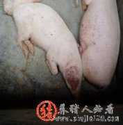 败血症型 最急性死亡的猪,剖检常无明显的病理变化。急性病例主要是以败血症为主要的特征变化。可见颈下、腹下及四肢末端等处皮肤有紫红色病灶(图2.3.13-11)。并可从天然孔流出暗红色血液,凝固不良。全身...