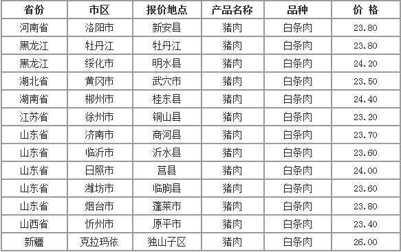 2022年9月25日全国各省市猪肉(白条肉)价格走势 单位:元/公斤 黑龙江巴彦县猪肉(白条肉)32.00 黑龙江安达市猪肉(白条肉)34.00 山东省莒县猪肉(白条肉)39.00 湖南省桃江县猪肉(白条肉)38.50 江苏省东海县猪肉(白条肉)30....