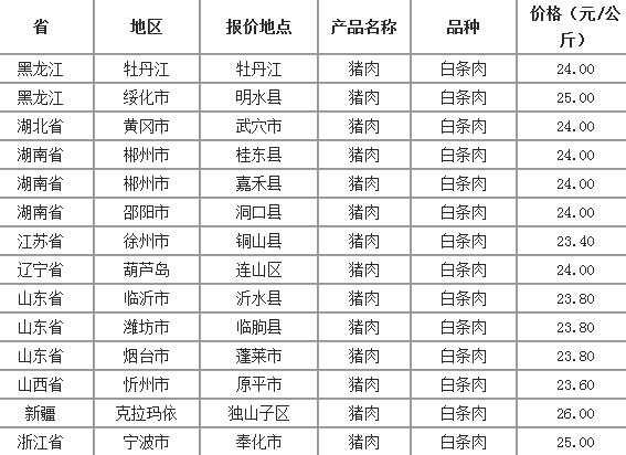 2022年9月24日全国各省市猪肉(白条肉)价格走势 单位:元/公斤 江苏省东海县猪肉(白条肉)30.00 湖南省溆浦县猪肉(白条肉)28.00 山东省章丘市猪肉(白条肉)32.00 山西省长治县猪肉(白条肉)30.00 河南省尉氏县猪肉(白条肉)2...