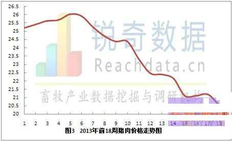 2013年第18周全国猪肉市场价格走势小幅震荡,猪肉终端消费低迷时期来临,本周猪肉市场价格走势继续小幅震荡,本周猪肉平均市场价格走势20.57元/千克,较上周下跌0.63元/千克,跌幅为2.97%(见图3)。随着大部分地区天气逐步转热,消费者更倾向于清淡的饮食习惯,不利于猪肉消费,猪市将迎来长达几个月的猪肉消费的低迷期。 走势图如下: