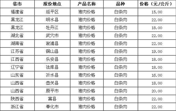 2022年9月29日全国各省市猪肉(白条肉)价格走势 单位:元/公斤 河北省新乐市猪肉(白条肉)32.00 河南省淇滨区猪肉(白条肉)38.00 湖南省溆浦县猪肉(白条肉)28.00 河北省安国市猪肉(白条肉)33.50 山东省福山区猪肉(白条肉)2...