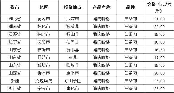 2022年6月28日全国各省市猪肉(白条肉)价格走势 单位:元/公斤 黑龙江安达市猪肉(白条肉)26.00 河北省尚义县猪肉(白条肉)26.00 广西横县猪肉(白条肉)23.00 甘肃省凉州区猪肉(白条肉)23.50 河北省桥东区猪肉(白条肉)25.00...