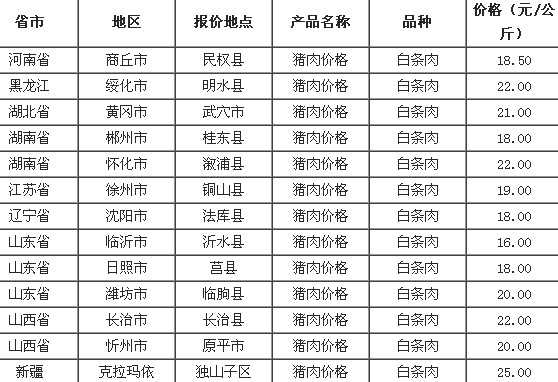 2022年5月31日全国各省市猪肉(白条肉)价格走势 单位:元/公斤 吉林省洮南市猪肉(白条肉)18.00 甘肃省凉州区猪肉(白条肉)20.00 甘肃省凉州区猪肉(白条肉)20.00 广东省东源县猪肉(白条肉)22.00 湖北省宜城市猪肉(白条肉)1...
