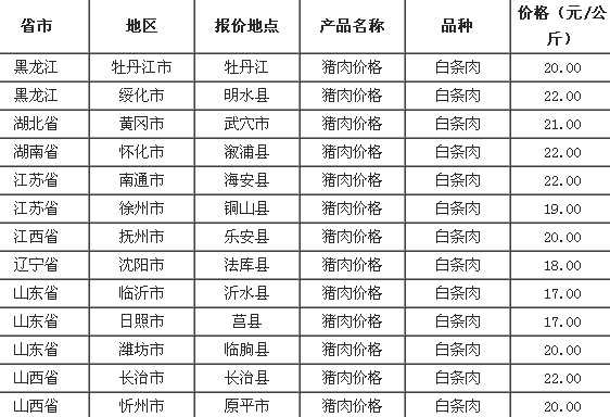 2022年11月3日全国各省市猪肉(白条肉)价格走势 单位:元/公斤 辽宁省本溪满族县猪肉(白条肉)40.00 山东省胶州市猪肉(白条肉)30.00 河北省临漳县猪肉(白条肉)34.00 甘肃省武山县猪肉(白条肉)32.00 河南省郸城县猪肉(白条...