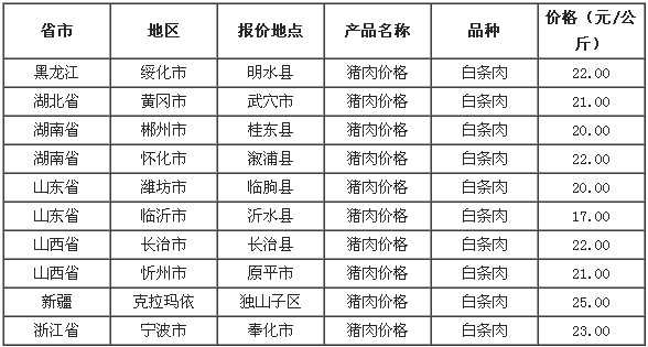 2022年10月16日全国各省市猪肉(白条肉)价格走势 单位:元/公斤 湖南省溆浦县猪肉(白条肉)34.00 吉林省靖宇县猪肉(白条肉)42.00 甘肃省凉州区猪肉(白条肉)38.00 四川省东坡区猪肉(白条肉)37.00 陕西省绥德县猪肉(白条肉)...