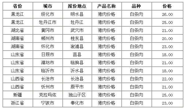 2022年6月28日全国各省市猪肉(白条肉)价格走势 单位:元/公斤 黑龙江安达市猪肉(白条肉)26.00 河北省尚义县猪肉(白条肉)26.00 广西横县猪肉(白条肉)23.00 甘肃省凉州区猪肉(白条肉)23.50 河北省桥东区猪肉(白条肉)25.00...