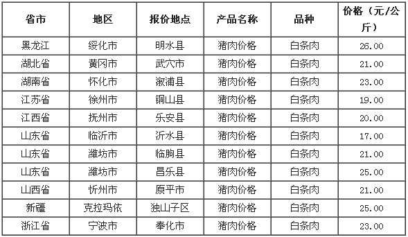 2022年6月28日全国各省市猪肉(白条肉)价格走势 单位:元/公斤 黑龙江安达市猪肉(白条肉)26.00 河北省尚义县猪肉(白条肉)26.00 广西横县猪肉(白条肉)23.00 甘肃省凉州区猪肉(白条肉)23.50 河北省桥东区猪肉(白条肉)25.00...