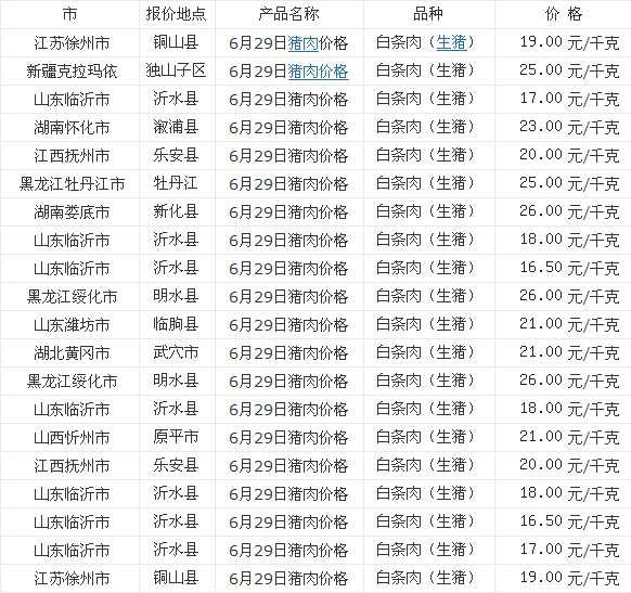 2022年6月28日全国各省市猪肉(白条肉)价格走势 单位:元/公斤 黑龙江安达市猪肉(白条肉)26.00 河北省尚义县猪肉(白条肉)26.00 广西横县猪肉(白条肉)23.00 甘肃省凉州区猪肉(白条肉)23.50 河北省桥东区猪肉(白条肉)25.00...