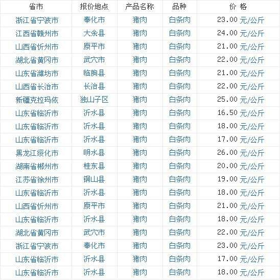 2022年10月11日全国各省市猪肉(白条肉)价格走势 单位:元/公斤 湖南省溆浦县猪肉(白条肉)32.00 山东省乳山市猪肉(白条肉)37.00 江苏省江宁区猪肉(白条肉)29.00 河北省沧县猪肉(白条肉)30.00 广东省普宁市猪肉(白条肉)36...