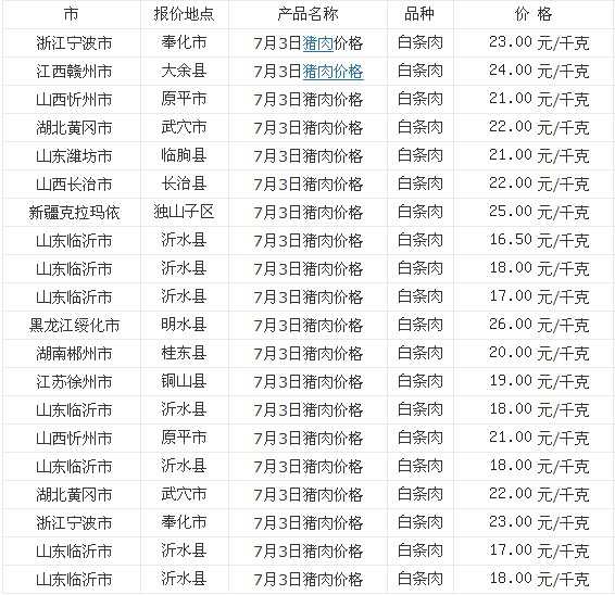 2022年10月3日全国各省市猪肉(白条肉)价格走势 单位:元/公斤 甘肃省陇西县猪肉(白条肉)24.00 广西上林县猪肉(白条肉)37.00 四川省中江县猪肉(白条肉)30.80 山东省章丘市猪肉(白条肉)32.00 辽宁省阜新自治县猪肉(白条肉...
