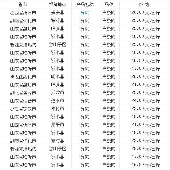 2022年9月25日全国各省市猪肉(白条肉)价格走势 单位:元/公斤 黑龙江巴彦县猪肉(白条肉)32.00 黑龙江安达市猪肉(白条肉)34.00 山东省莒县猪肉(白条肉)39.00 湖南省桃江县猪肉(白条肉)38.50 江苏省东海县猪肉(白条肉)30....