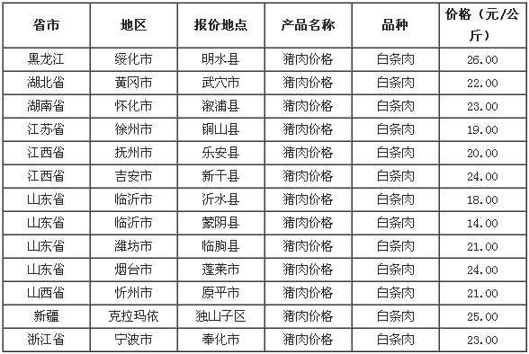 2022年8月26日全国各省市猪肉(白条肉)价格走势 单位:元/公斤 安徽省砀山县猪肉(白条肉)34.00 甘肃省陇西县猪肉(白条肉)24.00 广东省梅县区猪肉(白条肉)35.00 云南省隆阳区猪肉(白条肉)28.00 山西省河津市猪肉(白条肉)2...