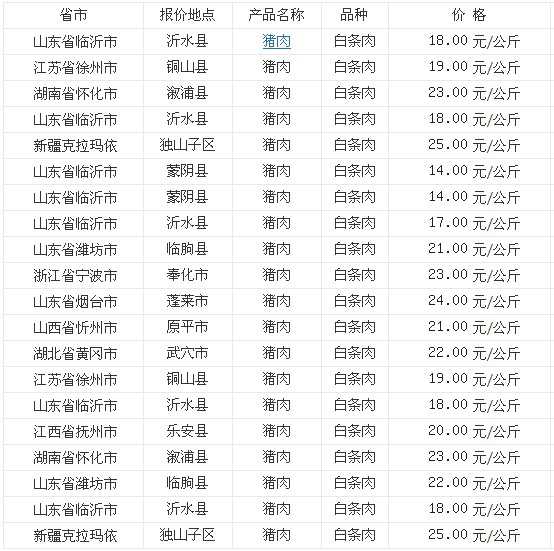 2022年8月7日全国各省市猪肉(白条肉)价格走势 单位:元/公斤 山西省长治县猪肉(白条肉)28.00 河北省沧县猪肉(白条肉)25.00 广西横县猪肉(白条肉)29.40 湖北省宜城市猪肉(白条肉)24.00 辽宁省黑山县猪肉(白条肉)27.00 湖...