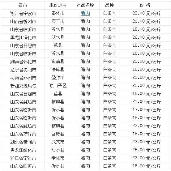 2022年10月11日全国各省市猪肉(白条肉)价格走势 单位:元/公斤 湖南省溆浦县猪肉(白条肉)32.00 山东省乳山市猪肉(白条肉)37.00 江苏省江宁区猪肉(白条肉)29.00 河北省沧县猪肉(白条肉)30.00 广东省普宁市猪肉(白条肉)36...